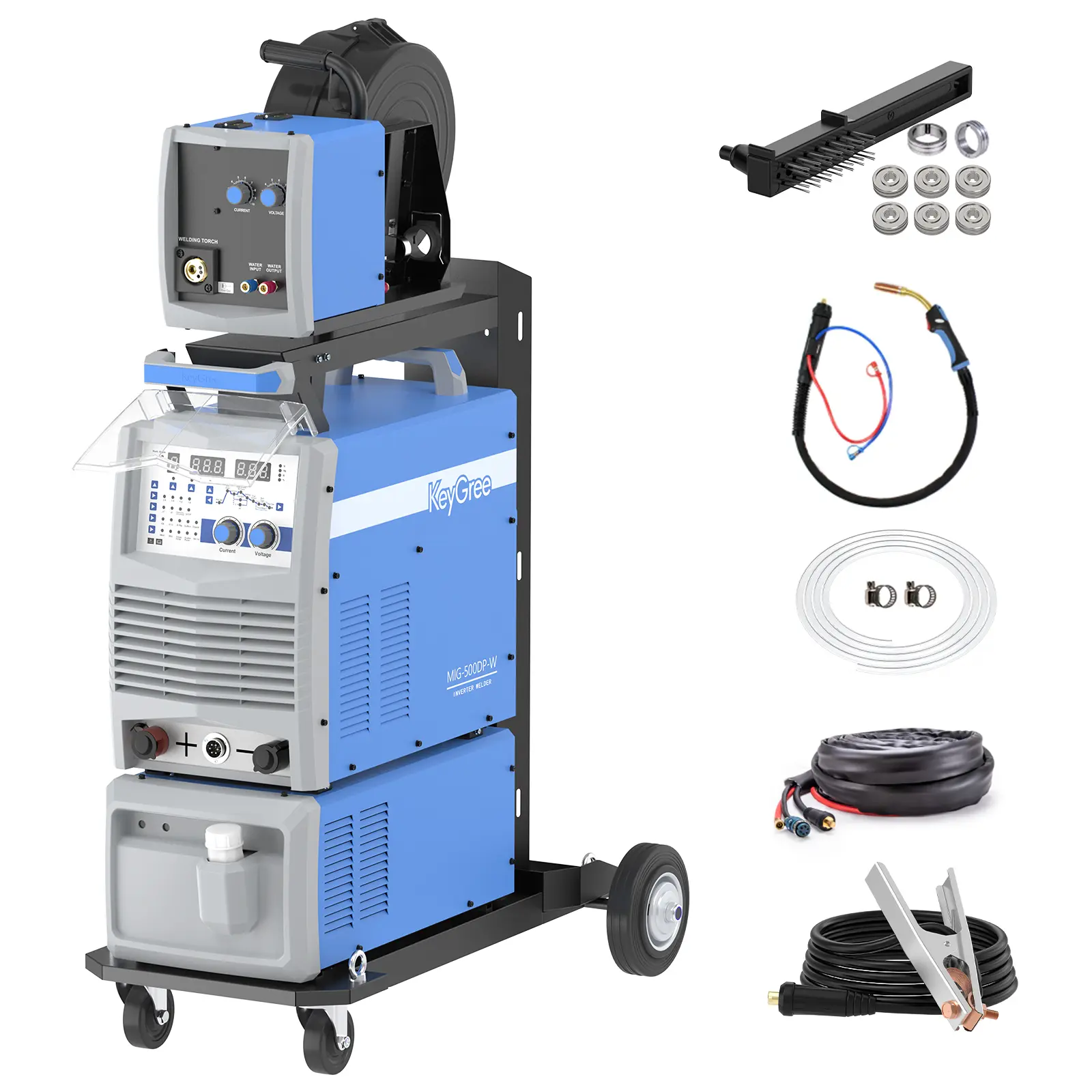 The MIG-350DP-W/500DP-W welding machine is a multi-functional welding equipment. It adopts full-bridge inverter soft-switching control technology, dual IGBT modules, and fast recovery diode modules, and is suitable for products that weld low-carbon steel, stainless steel, and aluminum alloys, etc. Its unique welding techniques, such as pulse and dual-pulse modes, can improve welding quality and production efficiency, especially in solving complex production problems with remarkable effects. The dual-pulse welding mode can make the weld seam reach the level of argon arc welding, which is due to the precise control of the heat in the welding metal. The pulse process is particularly suitable for welding stainless steel and aluminum alloys. In the semi-automatic welding mode (MIG/MAG), you can save the set welding parameter settings and reuse them when necessary. This optimizes the working time of welders. The device is equipped with wheels for mobility and a cart with a reserved space for gas tank placement, enhancing its mobility. It has a detachable wire feeding device and a water tank.